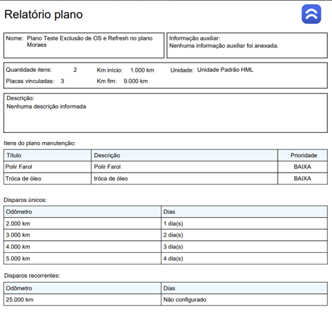O documento reúne todas as informações configuradas no plano, incluindo: dados gerais (nome, unidade, quantidade de itens e placas vinculadas), descrição do plano, itens do plano de manutenção com suas prioridades e disparos únicos e recorrentes configurados.