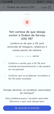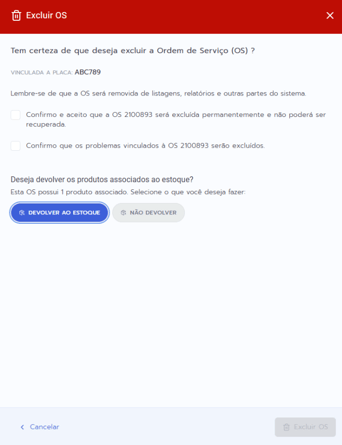 - Exclusão com opção de devolução: ao excluir uma O.S. ou problema, é possível definir se os produtos vinculados devem ou não retornar ao estoque.