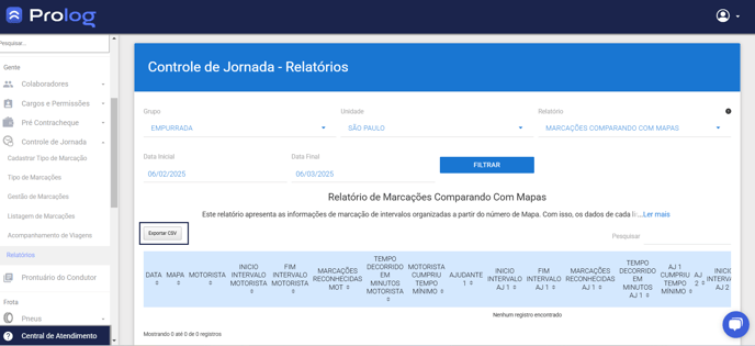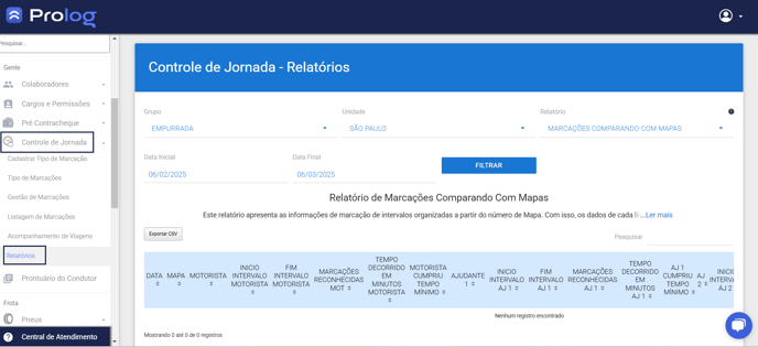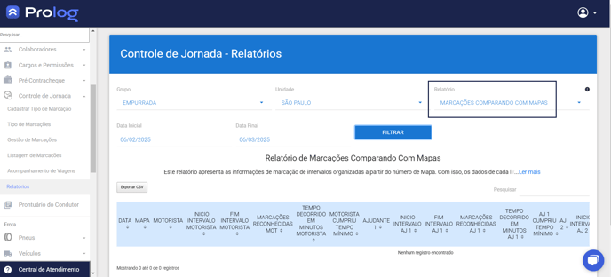 Este relatório apresenta as informações de marcação de intervalos organizadas a partir do número de Mapa. Com isso, os dados de cada linha representam as marcações dos colaboradores pertencentes à uma determinada rota.