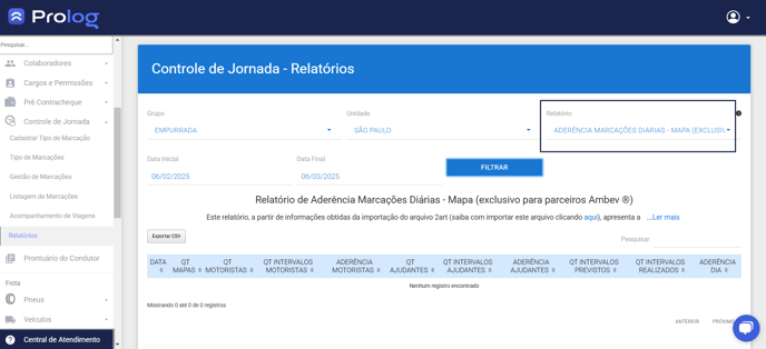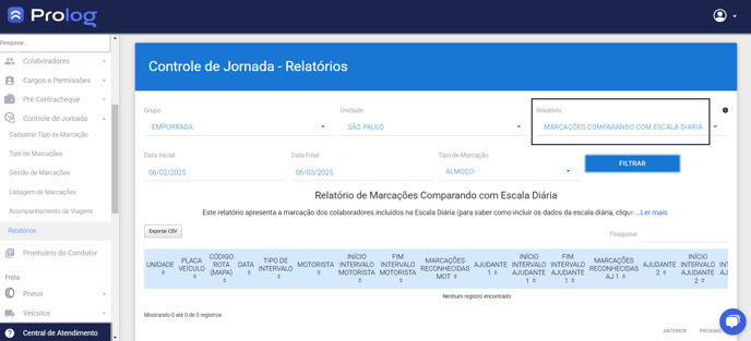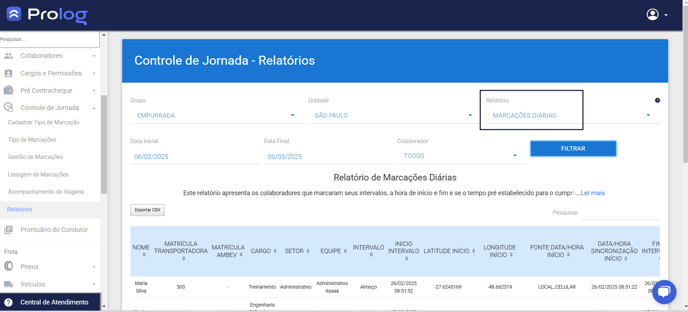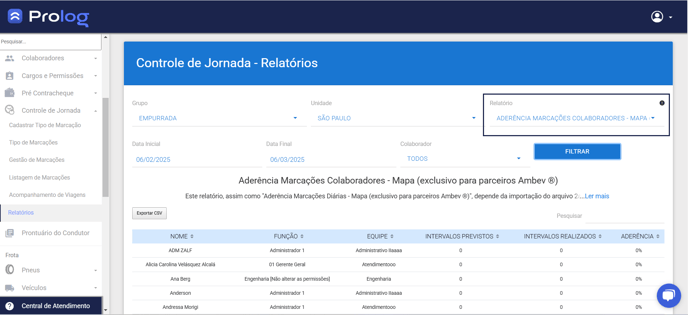 Este relatório apresenta a marcação dos colaboradores incluídos na Escala Diária em tempo real. Com ele é possível saber se os motoristas e ajudantes em rota de entrega estão aderindo à sua função de fazer corretamente suas marcações de intervalo.