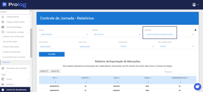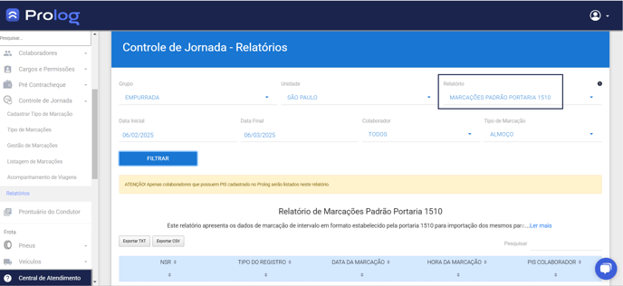 Este relatório apresenta os dados de marcação de intervalo em formato estabelecido pela portaria 1510 para importação dos mesmos para softwares de gestão de relógio ponto. Para isso, este relatório possui a opção Exportar TXT, onde é possível baixar o arquivo em formato de texto (formato comumente utilizado em softwares de gestão de relógio ponto).