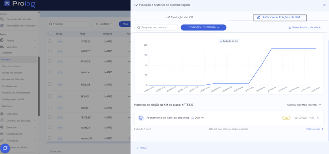 Apenas edições manuais são exibidas neste histórico. Caso algum processo altere o KM do veículo (checklist, aferição e etc), não irá gerar um histórico de edição.